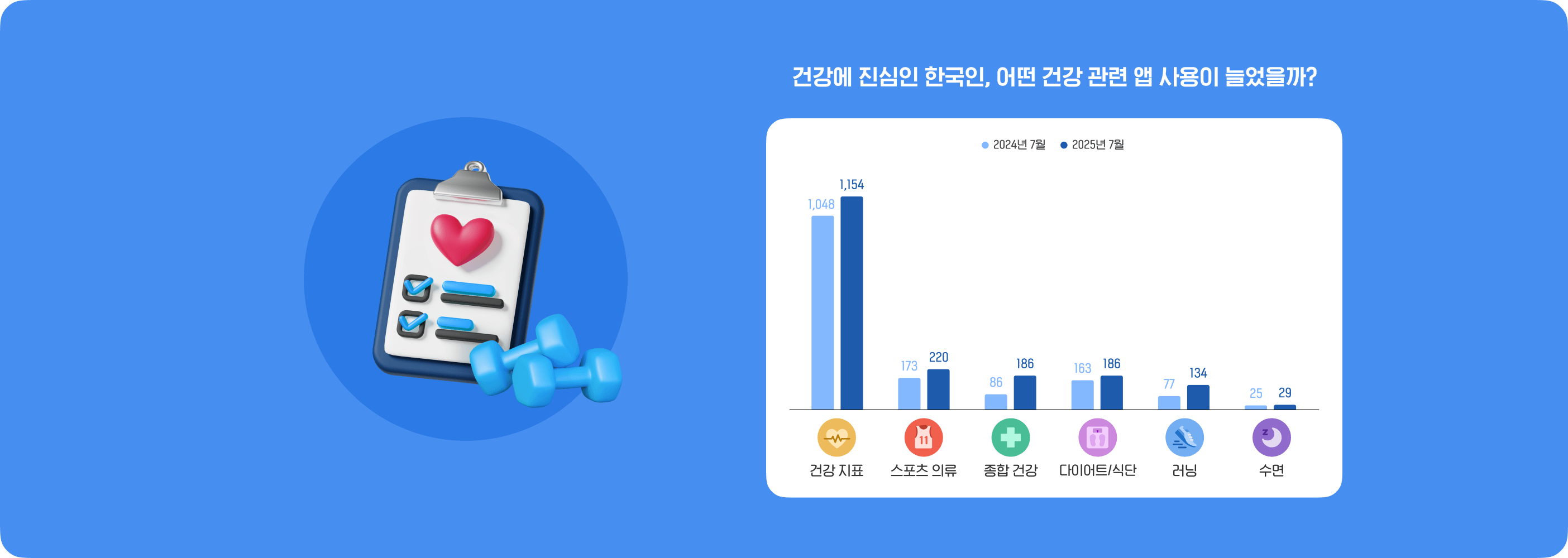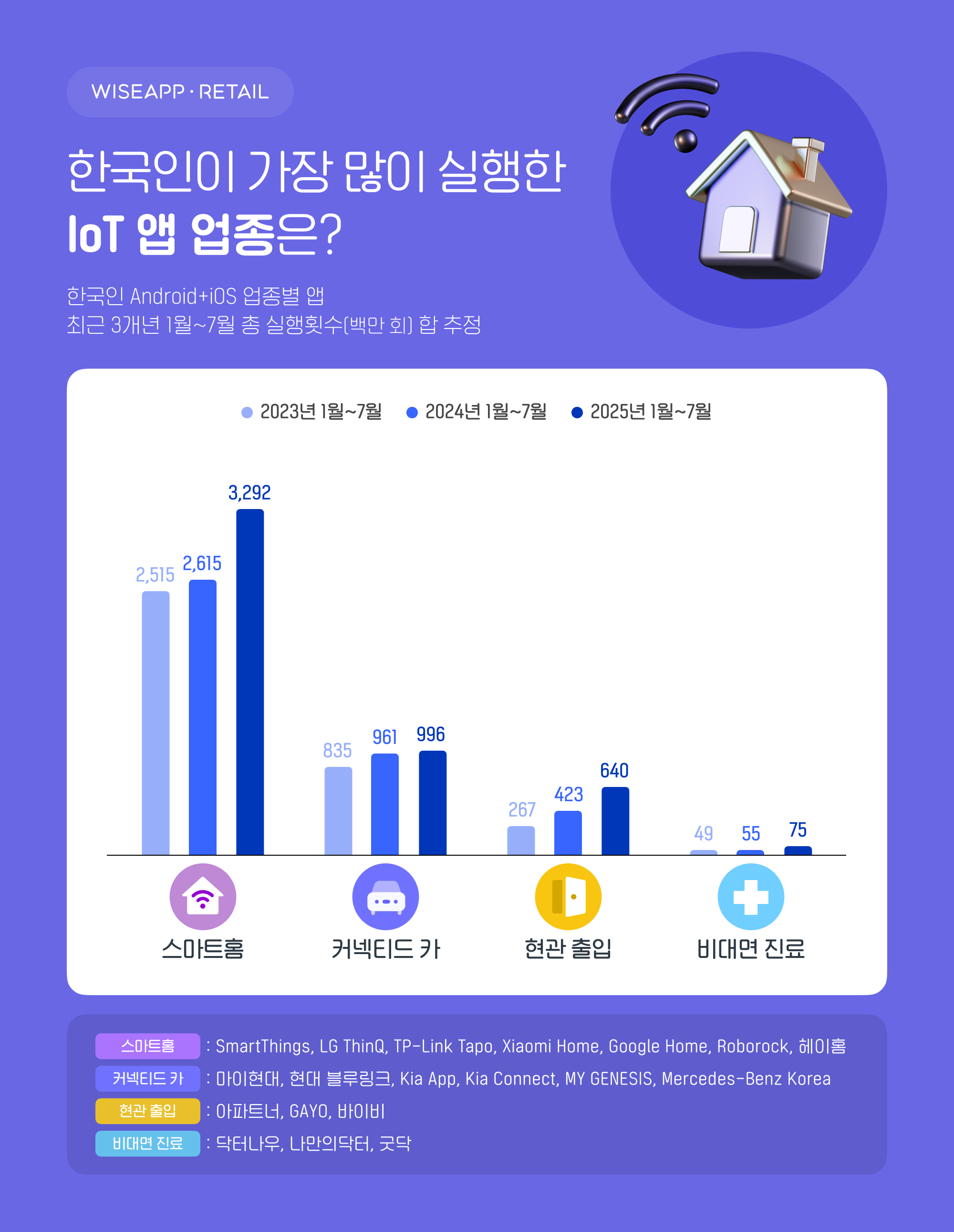 2025년 국내 IoT 앱 시장이 성장세를 보이고 있습니다. 지난 1월부터 7월까지 주요 IoT 앱 업종(스마트홈, 커넥티드 카, 현관 출입, 비대면 진료)의 총 실행 횟수가 2023년과 2024년 동기간 대비 2년 연속 증가한 것으로 나타났는데요, 자세한 내용은 인사이트에서 확인해 보세요!