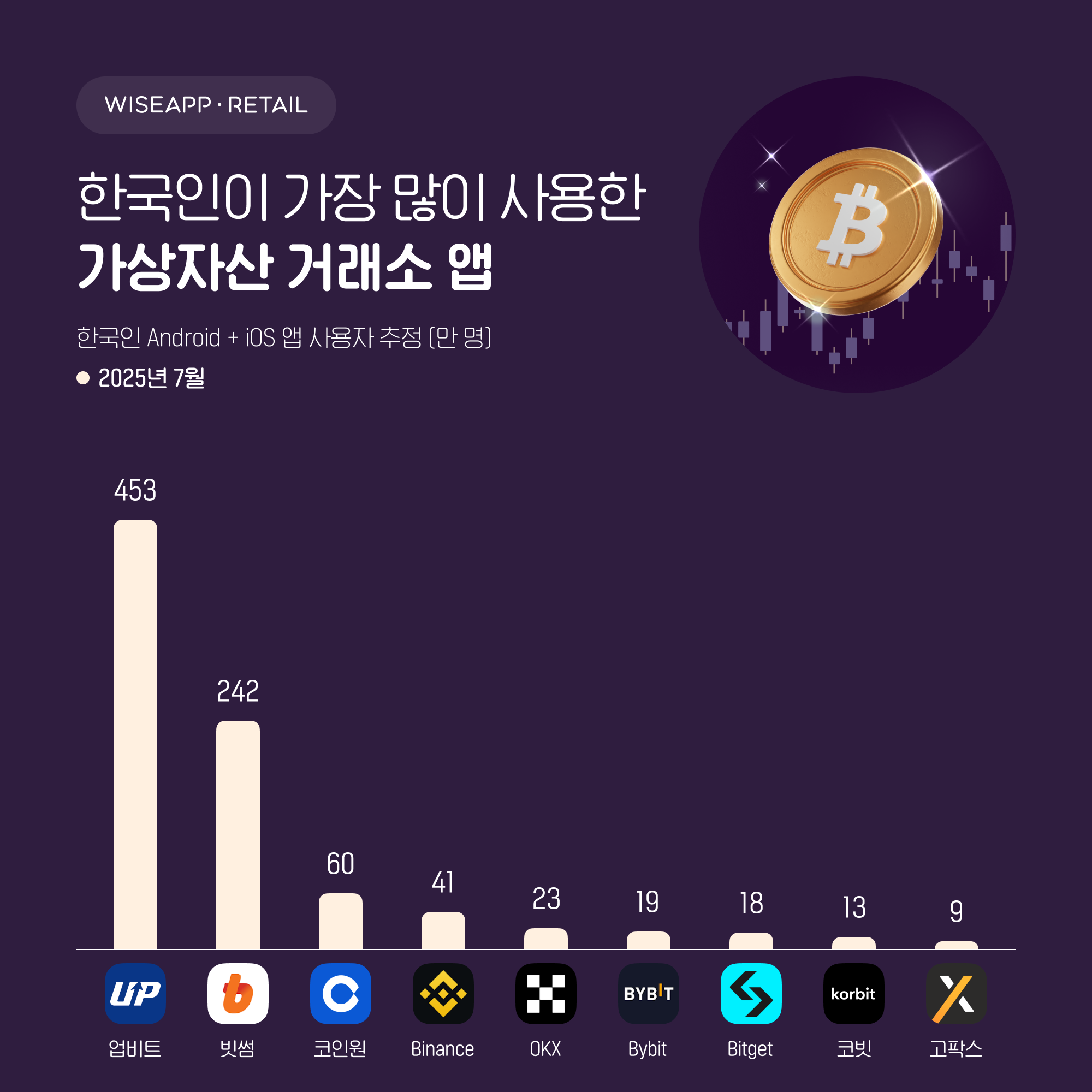 2025년 7월 가상자산 거래소 앱의 사용자, 사용 시간, 실행 횟수 지표별 순위에서 업비트는 1위, 빗썸을 2위를 굳건히 지키고 있습니다. 지표별 3위는 코인원, 비트겟, 바이낸스가 차지한 것으로 나타났는데요, 한국인이 가장 많이, 오래, 자주 사용한 가상자산 거래소 앱 순위와 주요 트렌드에 관한 자세한 내용은 인사이트에서 확인해 보세요!
