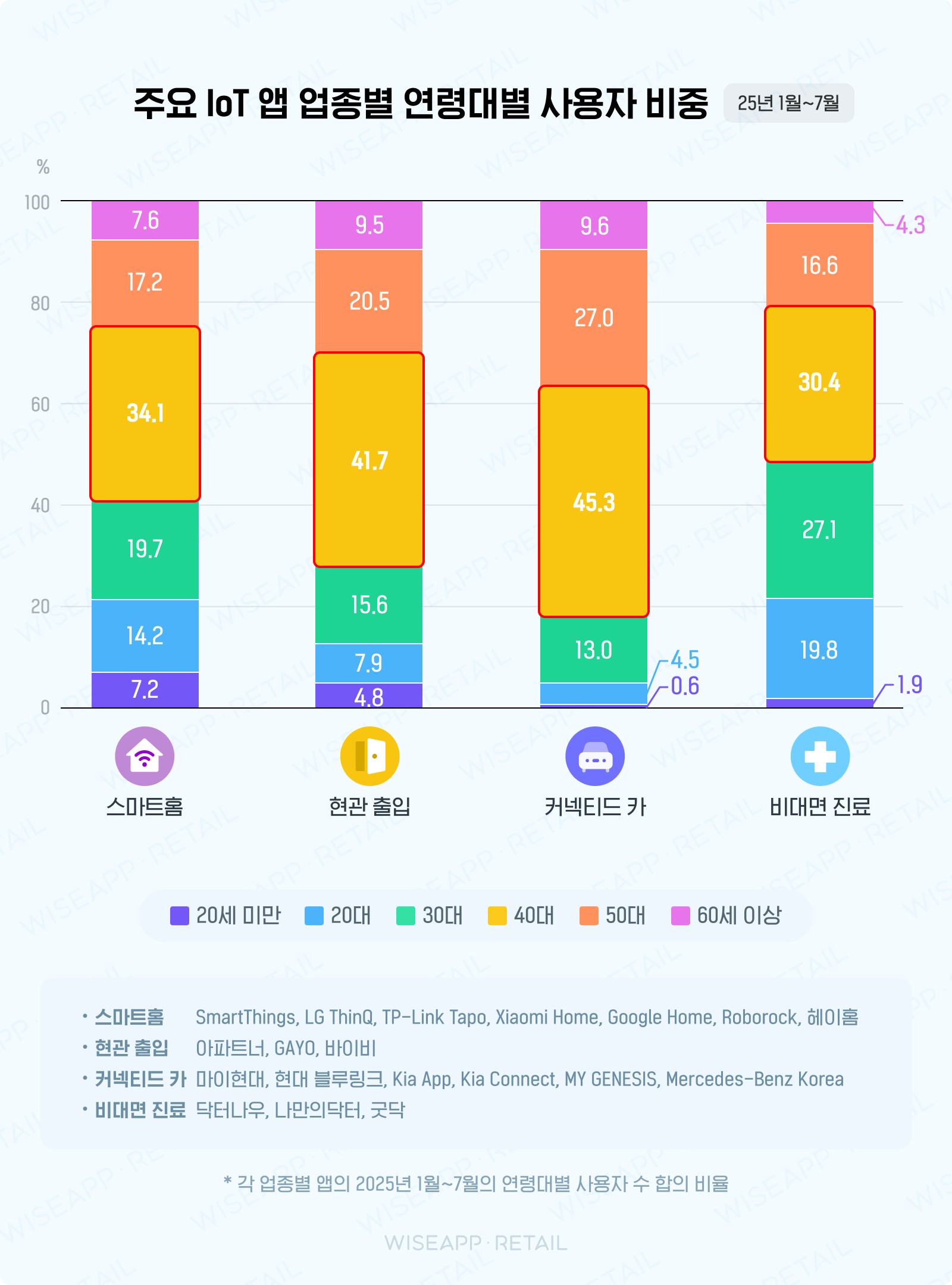 2025년 1월부터 7월까지주요 IoT 앱을사용하는연령대를 조사한 결과, 스마트홈, 현관출입, 커넥티드카, 비대면진료업종모두공통적으로 40대의비율이가장높았습니다. 그중비대면진료앱은 2030대, 커넥티드카앱은 50대사용자비율이높은것이특징이었는데요, 2025년 주요 IoT 앱 동향에 관한 자세한내용은인사이트에서확인해보세요!