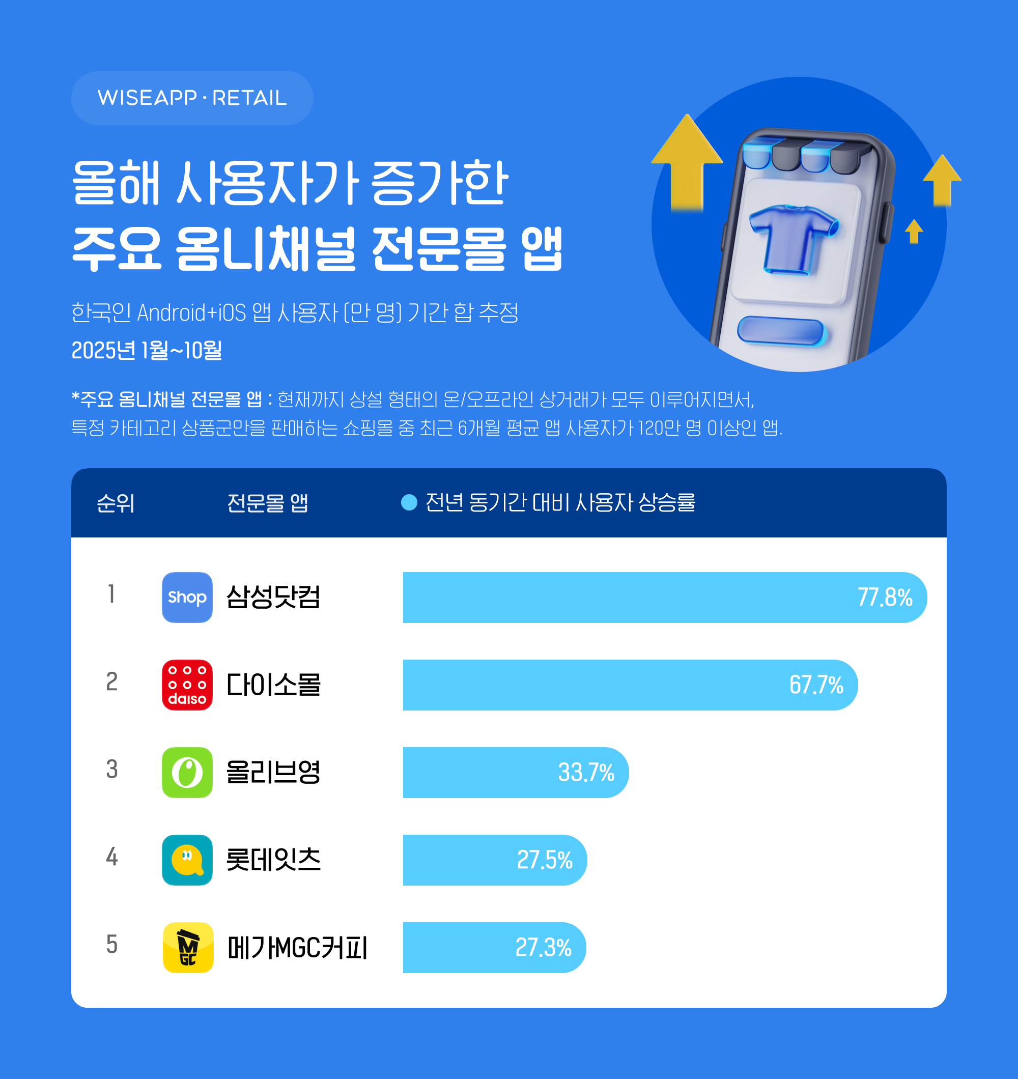 2025년 1월부터 10월까지 가장 많이 성장한 옴니채널 전문몰은 '삼성닷컴'으로 조사됐습니다. 옴니채널 전문몰 앱은 온/오프라인 상거래가 모두 이뤄지며, 특정 카테고리 상품군 위주로 판매하는 쇼핑 앱을 의미하는데요, 옴니채널 전문몰 순위에 대한 자세한 내용은 인사이트에서 확인해 보세요!